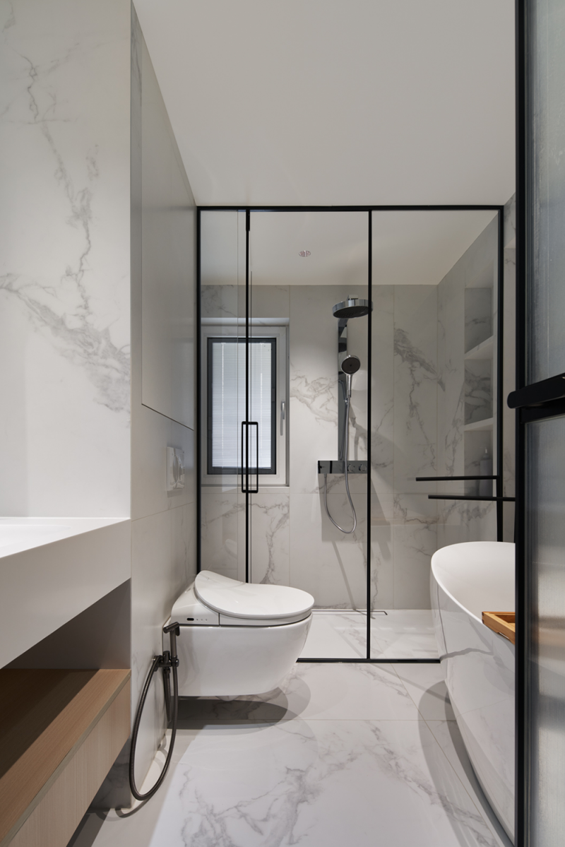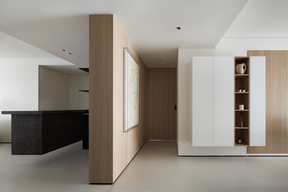 白色与木色将空间铺满,黑色作为点缀丰富空间质感。面对阳台矮梁,选用镜面材质包裹,通过折射延伸空间,弱化梁体存在感。