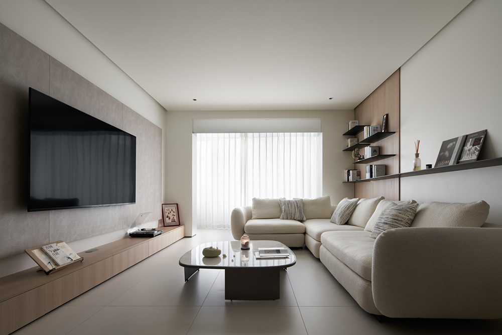 一个具有包裹感的沙发,一张柔软的地毯,一个简约的矮柜,低饱和色系的家具构成了这个清爽的多功能房。