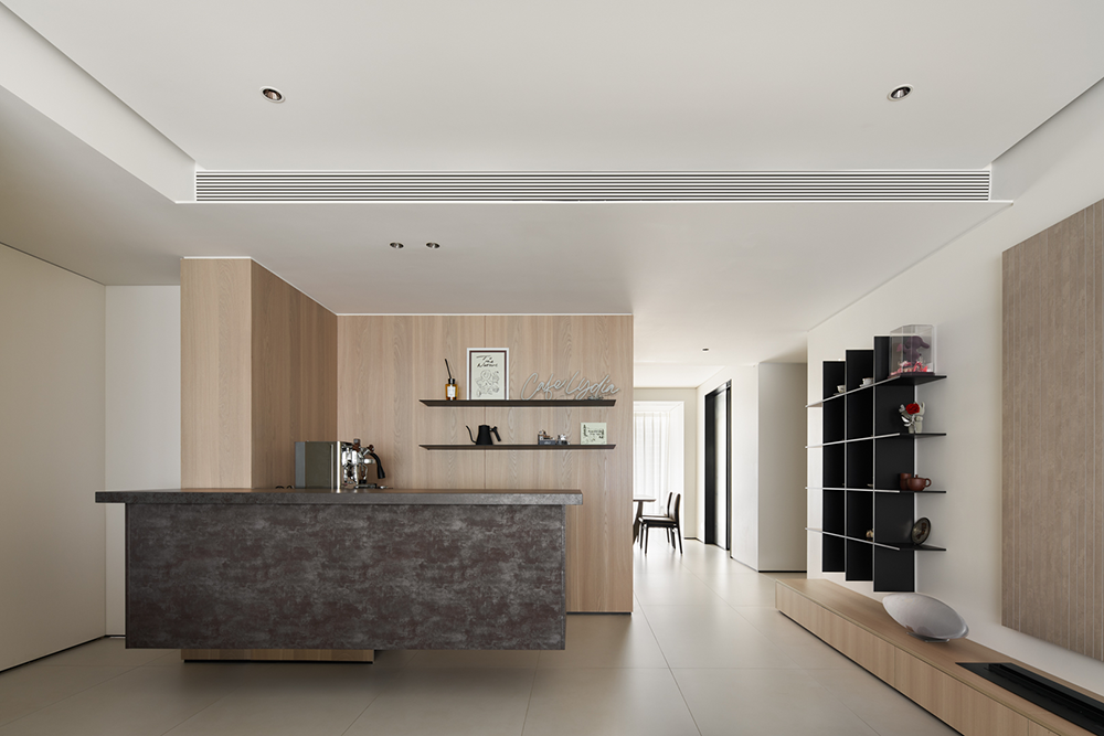黑色超薄钢板嵌入墙体,是特意留出的展示空间,给女主人的精致的咖啡工具留出空间。