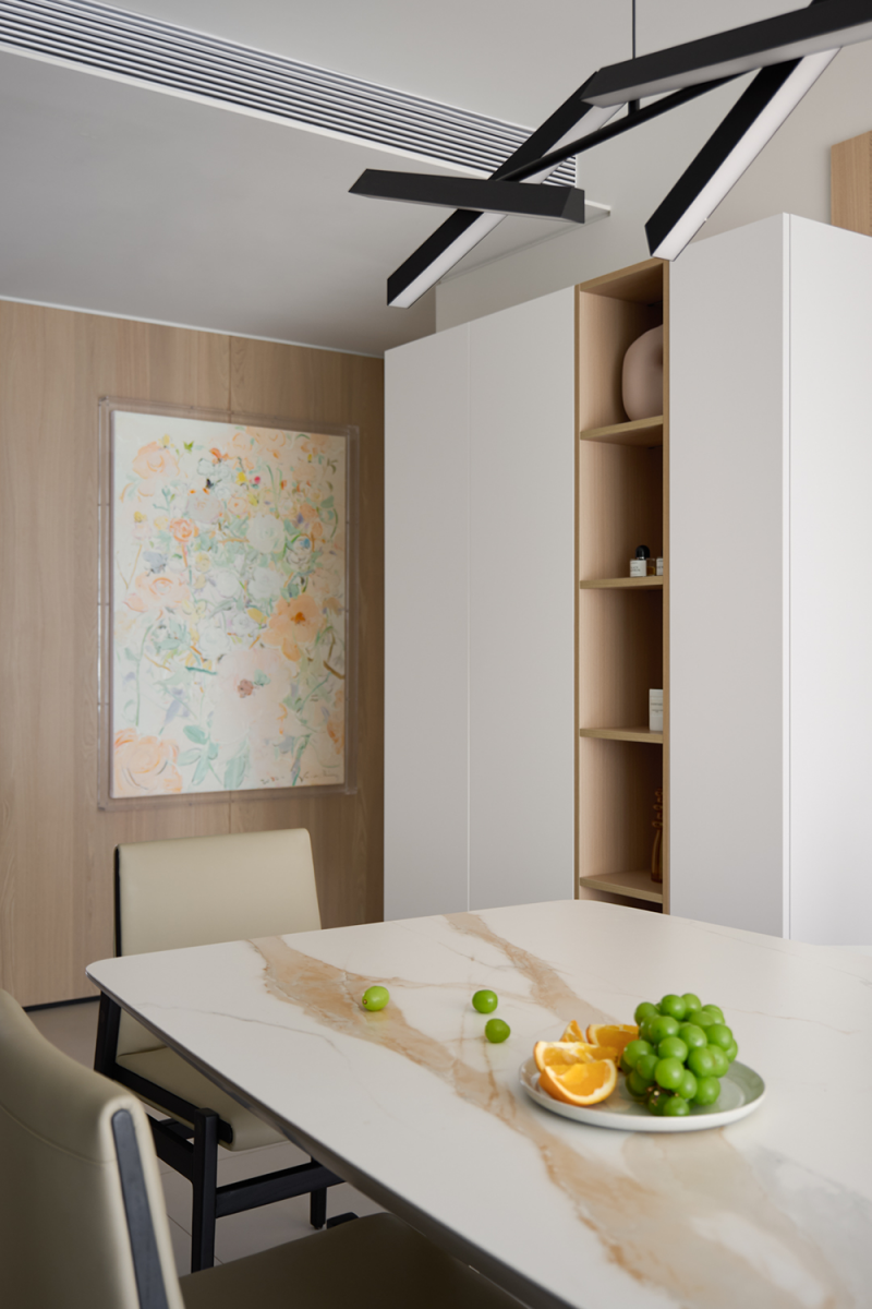 通过大量留白减少繁杂,用材质和色彩的碰撞留下纯粹的视觉感受。极具现代感的餐厅吊灯,