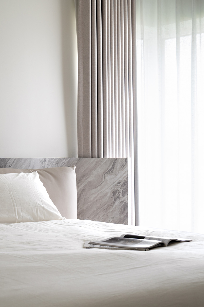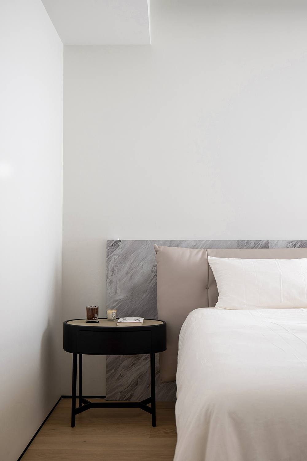 主卧打造成套间形式,纯净洁白是它的主色调,如流沙般的床头背景墙,好似将一切疲惫冲刷,弧形的床头背景墙给人安心的包裹感。