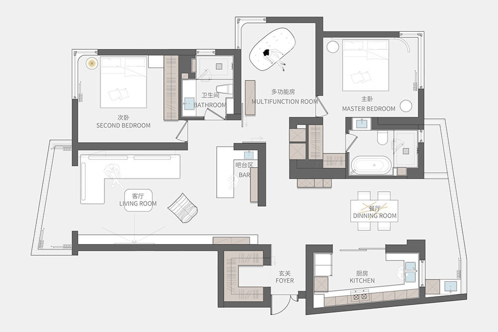 移门敞开时,多功能房、客厅、玄关彼此互通,通过矮柜增加收纳。