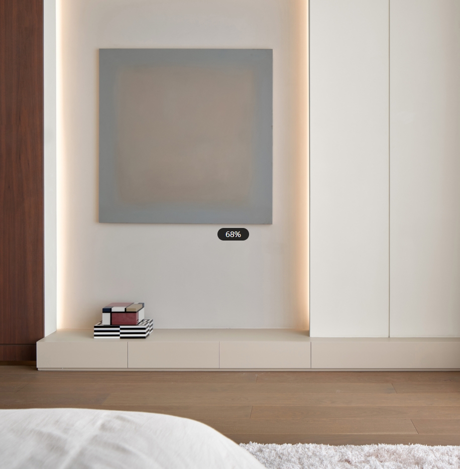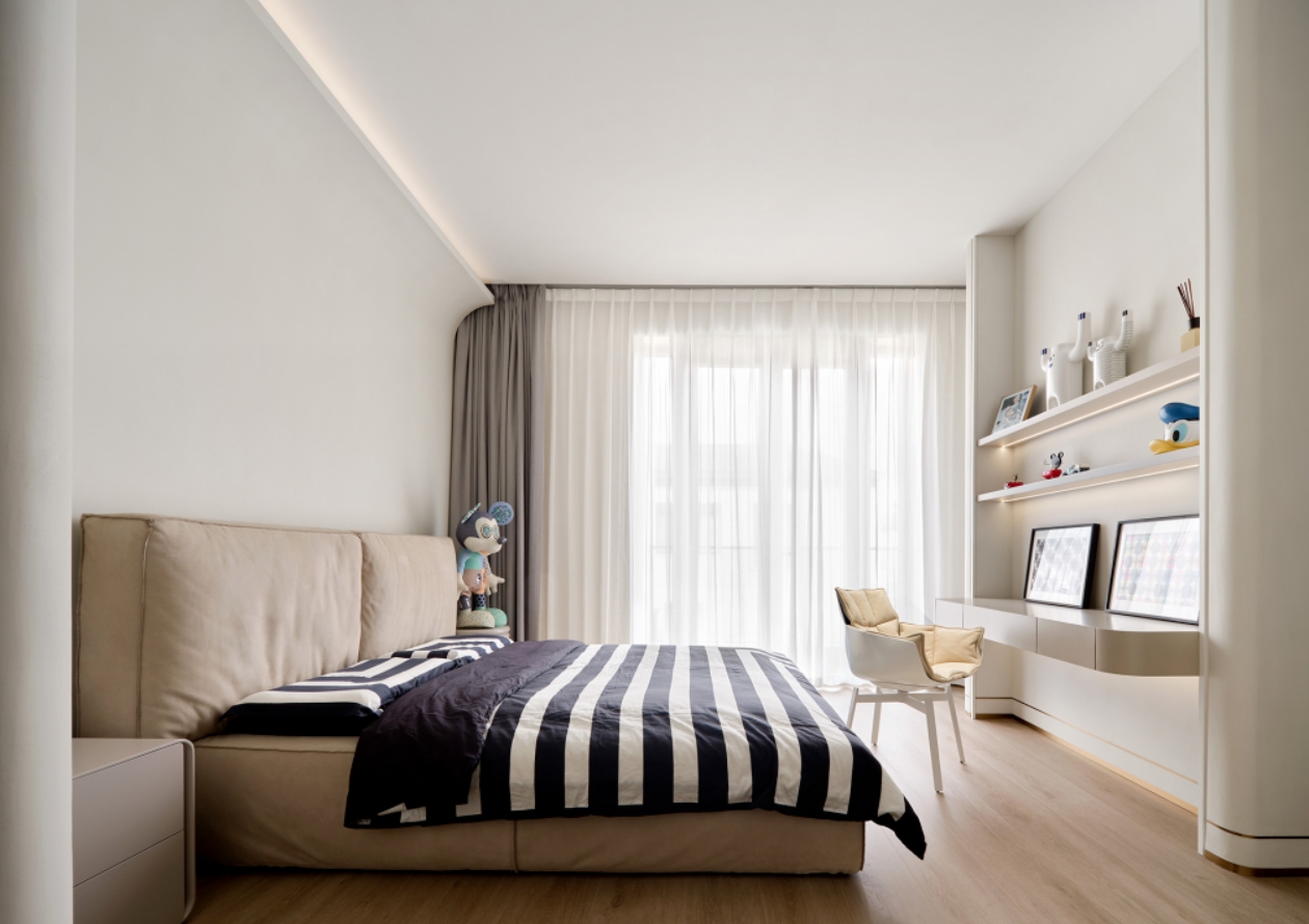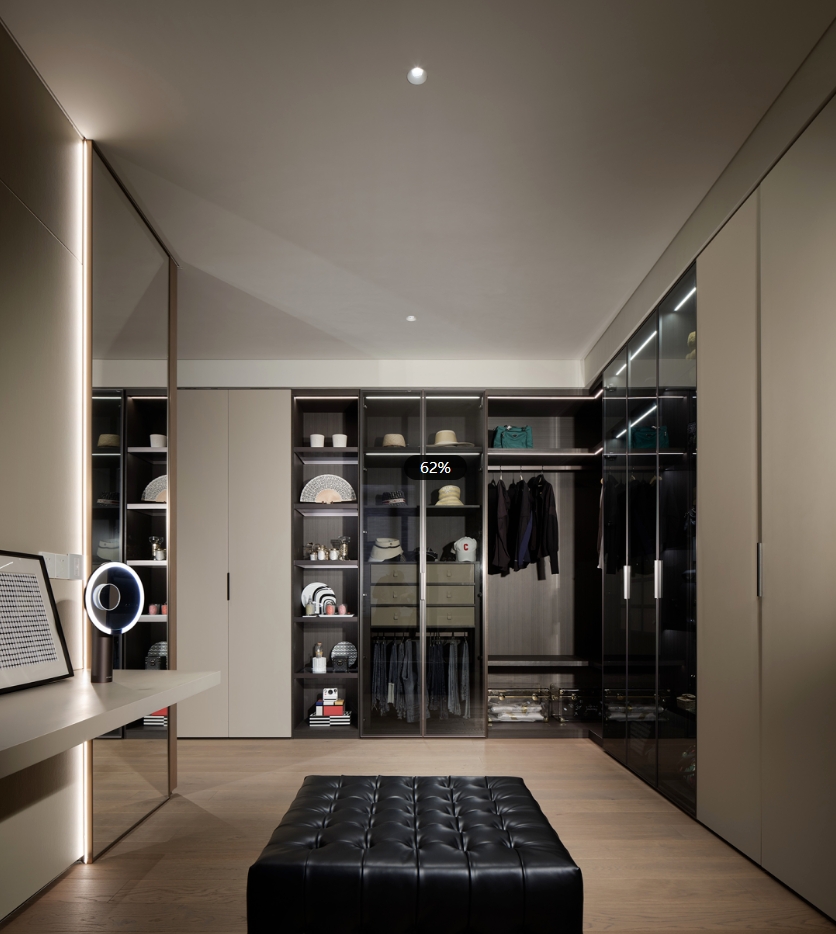 卧室、衣帽间和卫生间的组合形成一个层层递进的私密空间。家具也是装饰空间重要的元素之一,而设计师在这里非常注重家具的协调性和谐和。整个空间的氛围都围绕着安定和谐的主线展开。