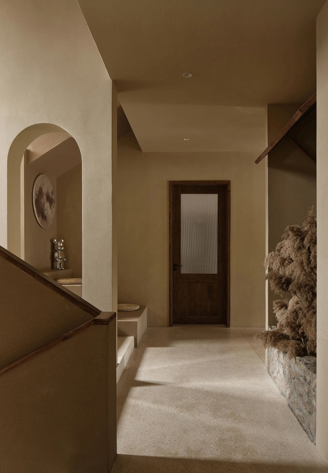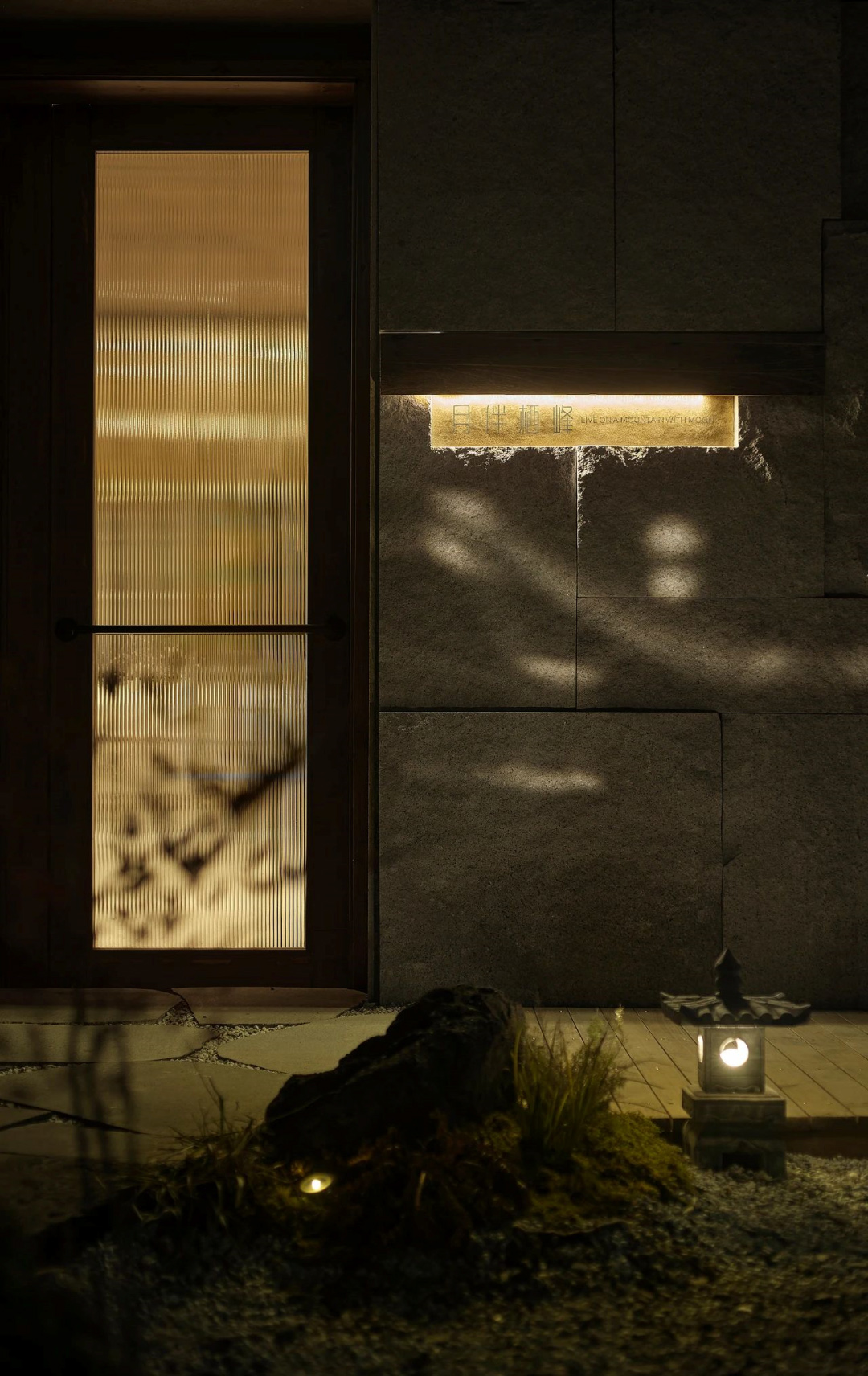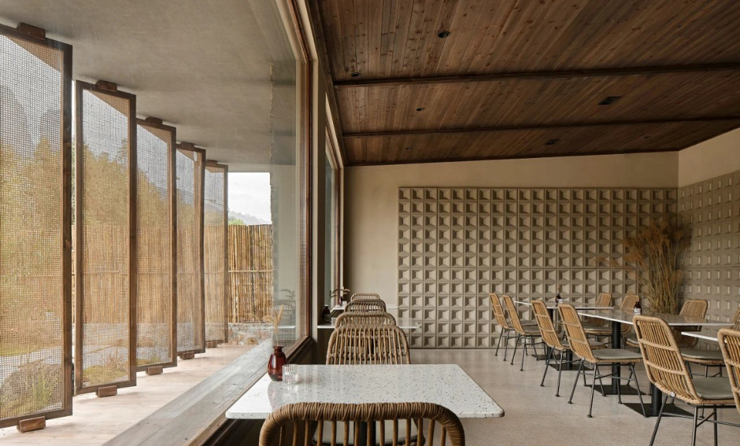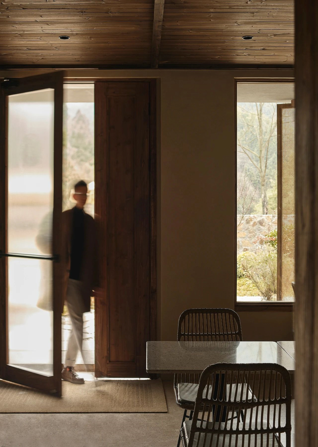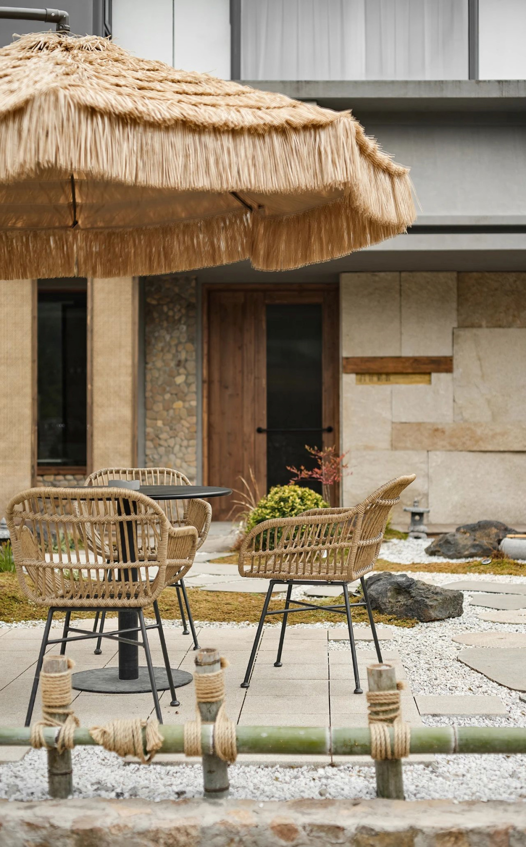 大堂的落地玻璃窗、茶室小火煮茶杯盏交错, 夜晚大厅点燃壁炉约好友围坐聊天,朴实无华的家具搭配当地的陶罐艺术品,门口的多个屏风呈现出几何造型的序列感,串联着侘寂风小院,光阴的流逝都变得缓慢。