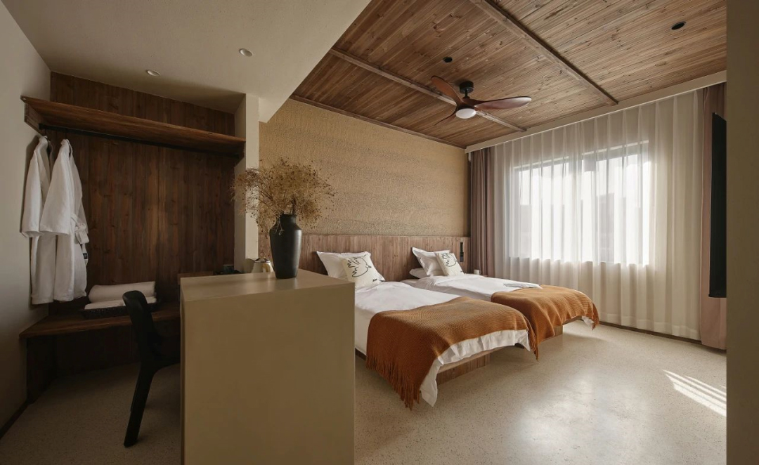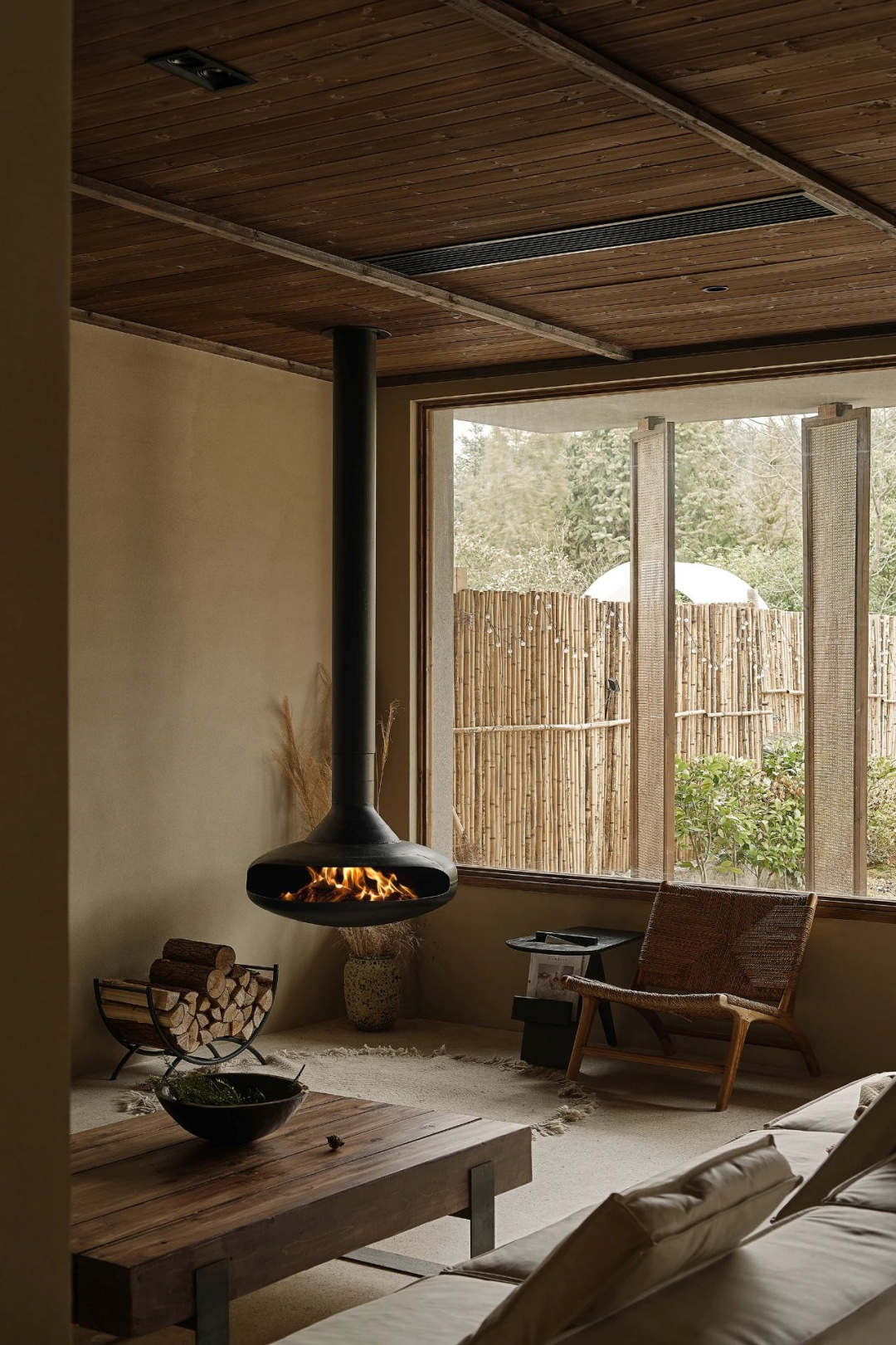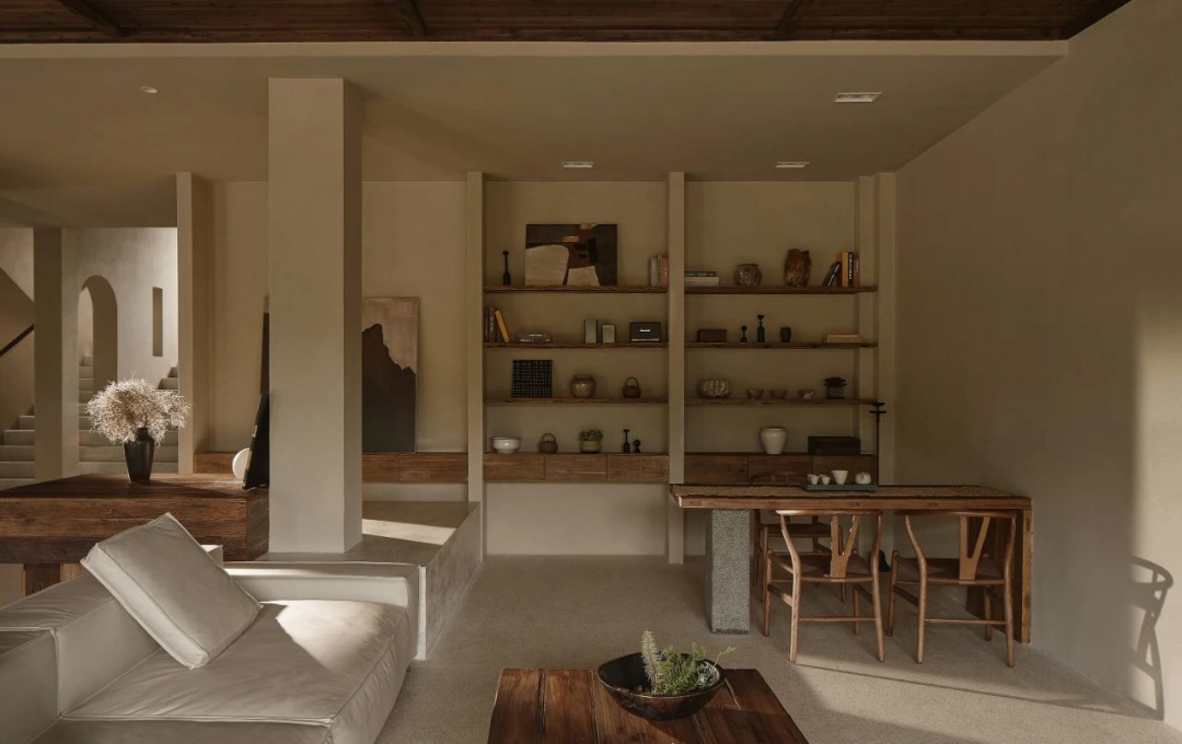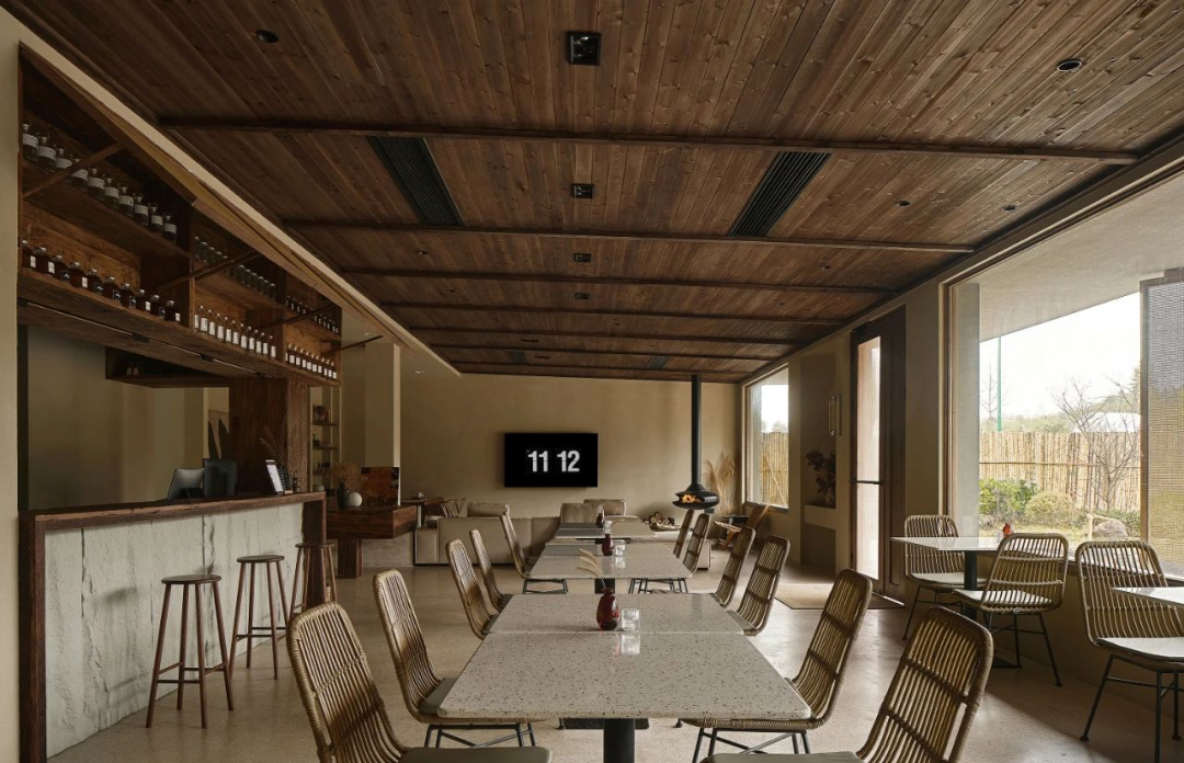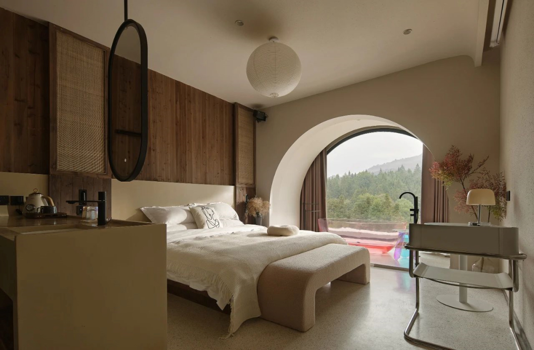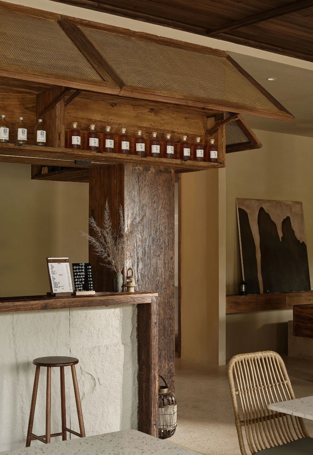大堂的落地玻璃窗、茶室小火煮茶杯盏交错, 夜晚大厅点燃壁炉约好友围坐聊天,朴实无华的家具搭配当地的陶罐艺术品,门口的多个屏风呈现出几何造型的序列感,串联着侘寂风小院,光阴的流逝都变得缓慢。