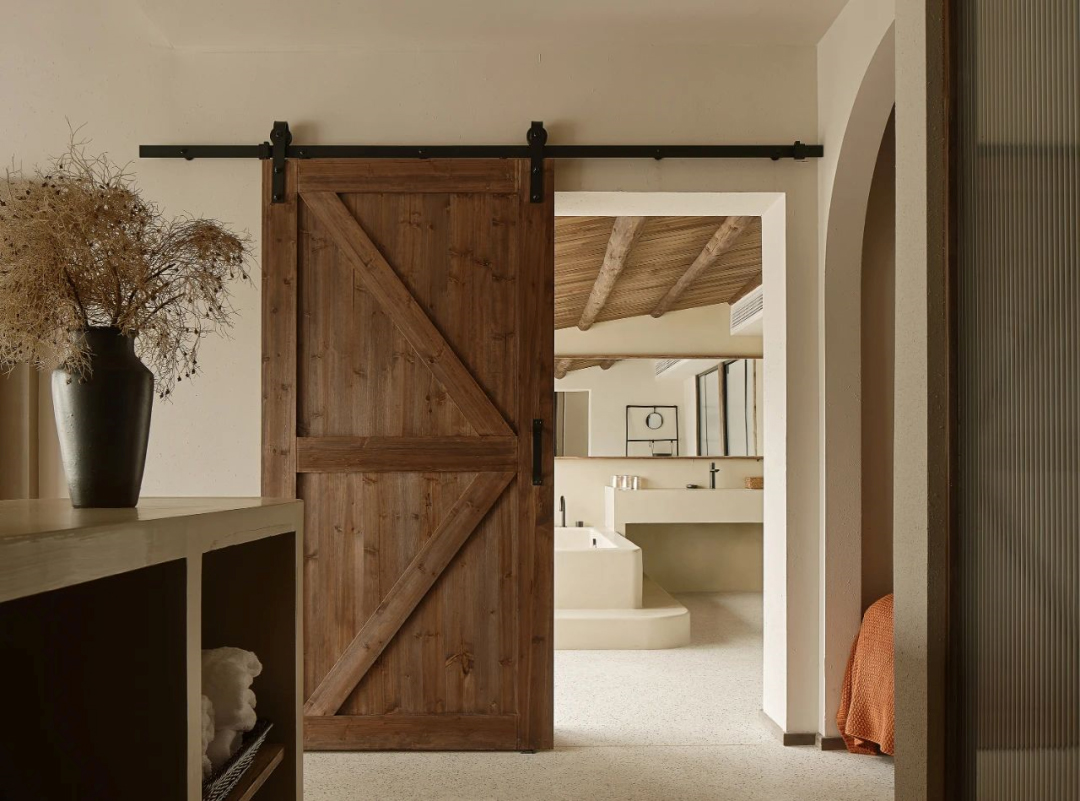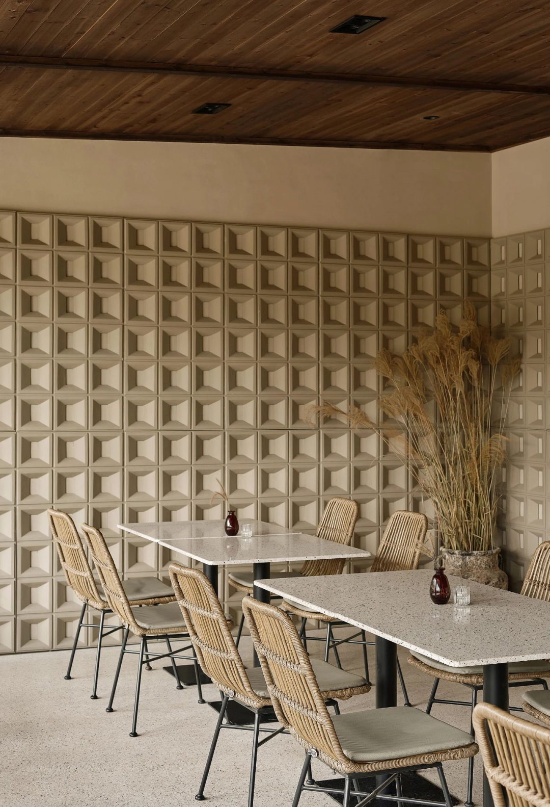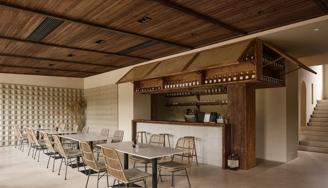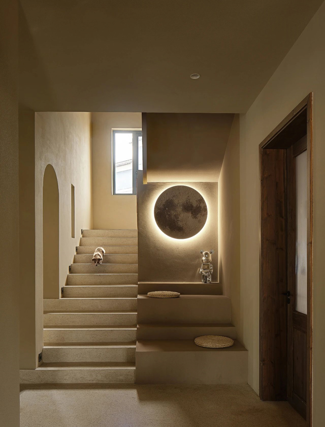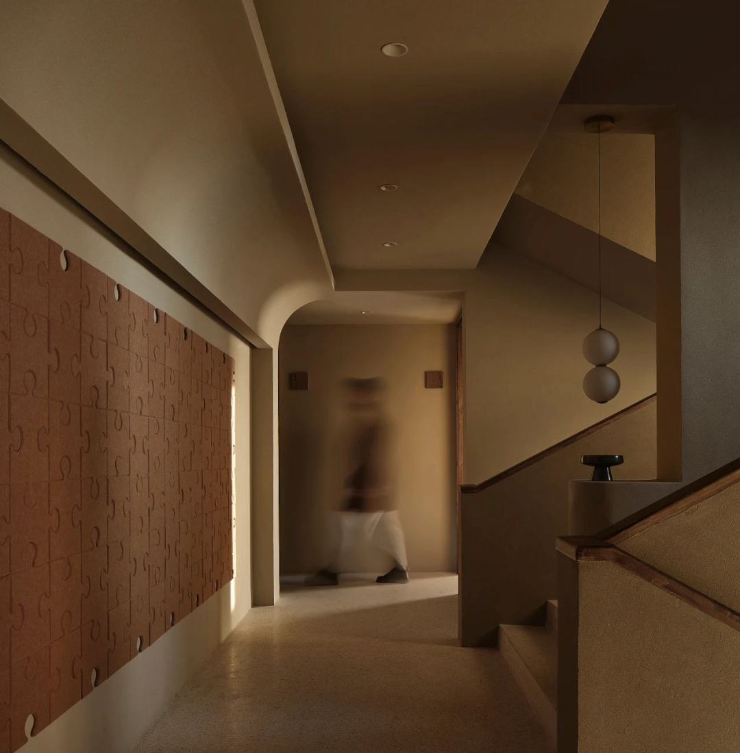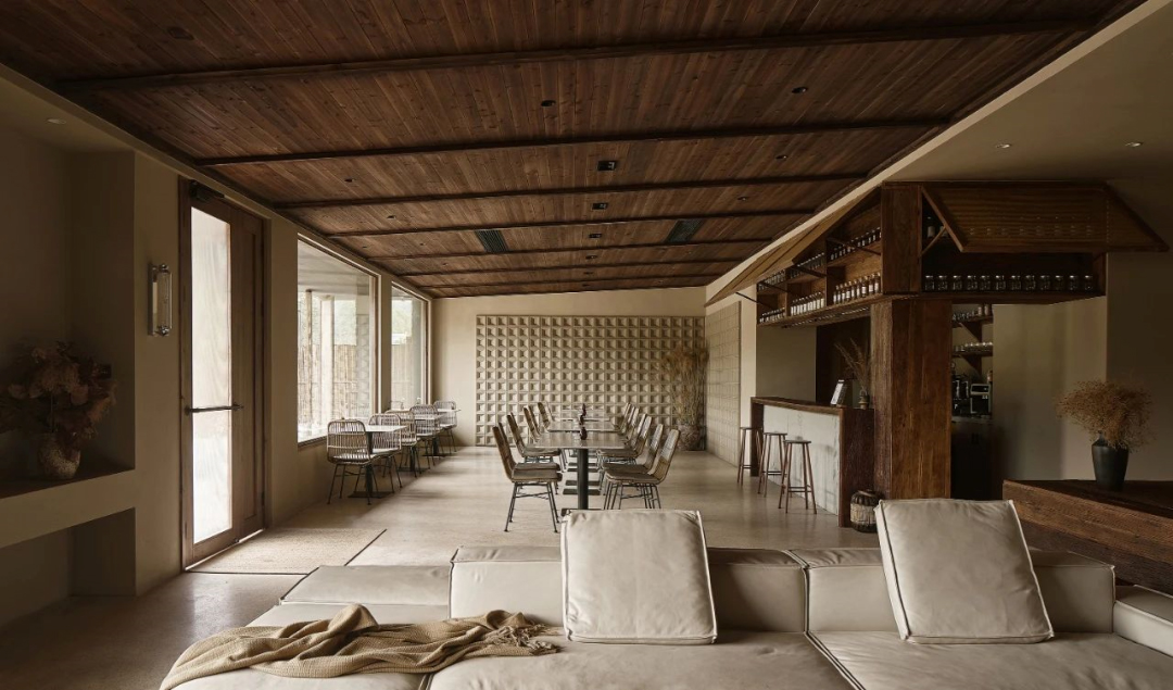 大堂的落地玻璃窗、茶室小火煮茶杯盏交错, 夜晚大厅点燃壁炉约好友围坐聊天,朴实无华的家具搭配当地的陶罐艺术品,门口的多个屏风呈现出几何造型的序列感,串联着侘寂风小院,光阴的流逝都变得缓慢。