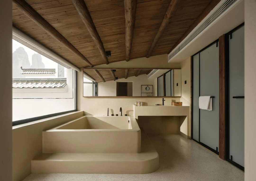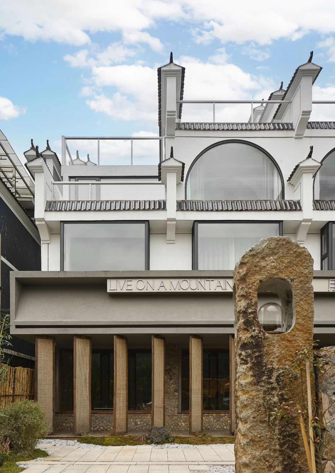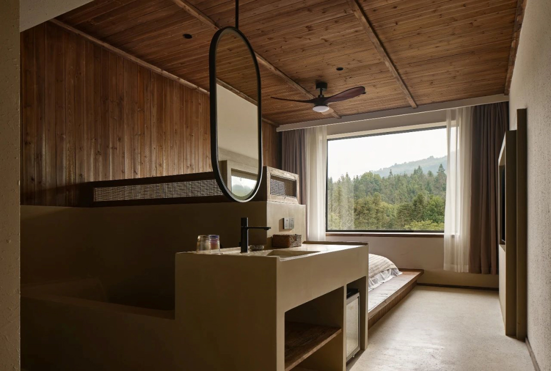 无遮挡的山景是项目的亮点,那就舍弃窗扇,整面的落地玻璃,让山景如画。建筑的外观因保持街道的统一不能太多改动,利用一层店招增加建筑纵向的层次,让黑瓦白墙原木也都成为有层次的色彩。干净的轮廓和温润的肌理,每一处的停留都能看到风景,闻到自然的味道,清淡不腻。侘寂风美学的民宿与空山隐野的契合,没有如织游人,没有过多雕琢,充盈着沉静原始之美。