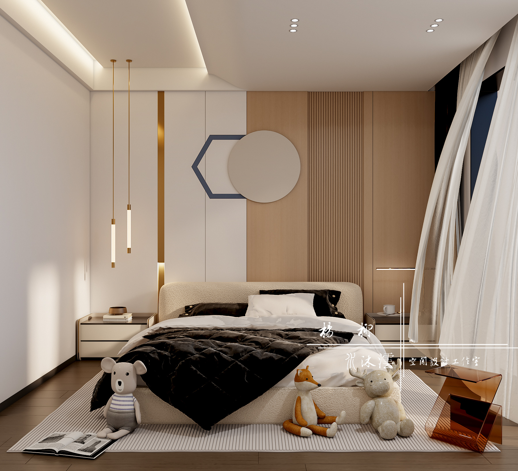 让空间消隐于环境与场域之中,活力、安静、跳跃、沉思。白色的张力,光影重叠,敏感交织,纯色的空间被几何线条打破,木、拉开空间温柔的序章,铺垫宁静的归属感。