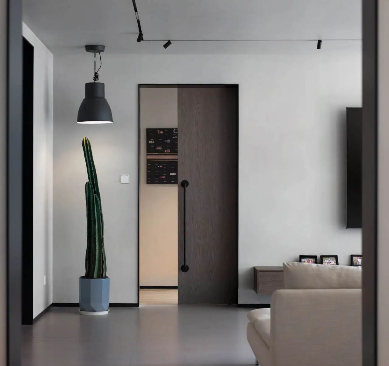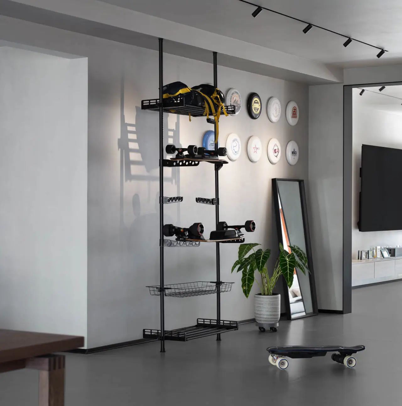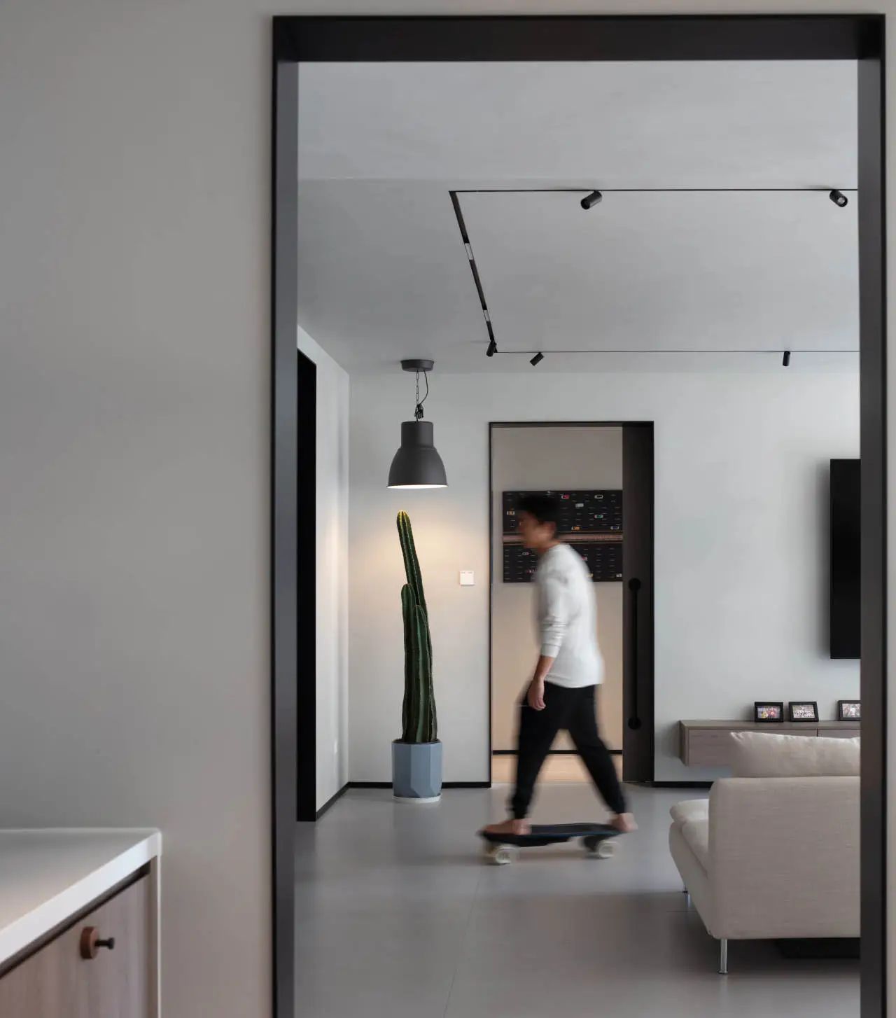 玄关区域则采用了极简设计理念,摒弃繁复装饰,仅增设了一处滑板架,既满足了日常收纳需求,又彰显了空间的实用与个性魅力。