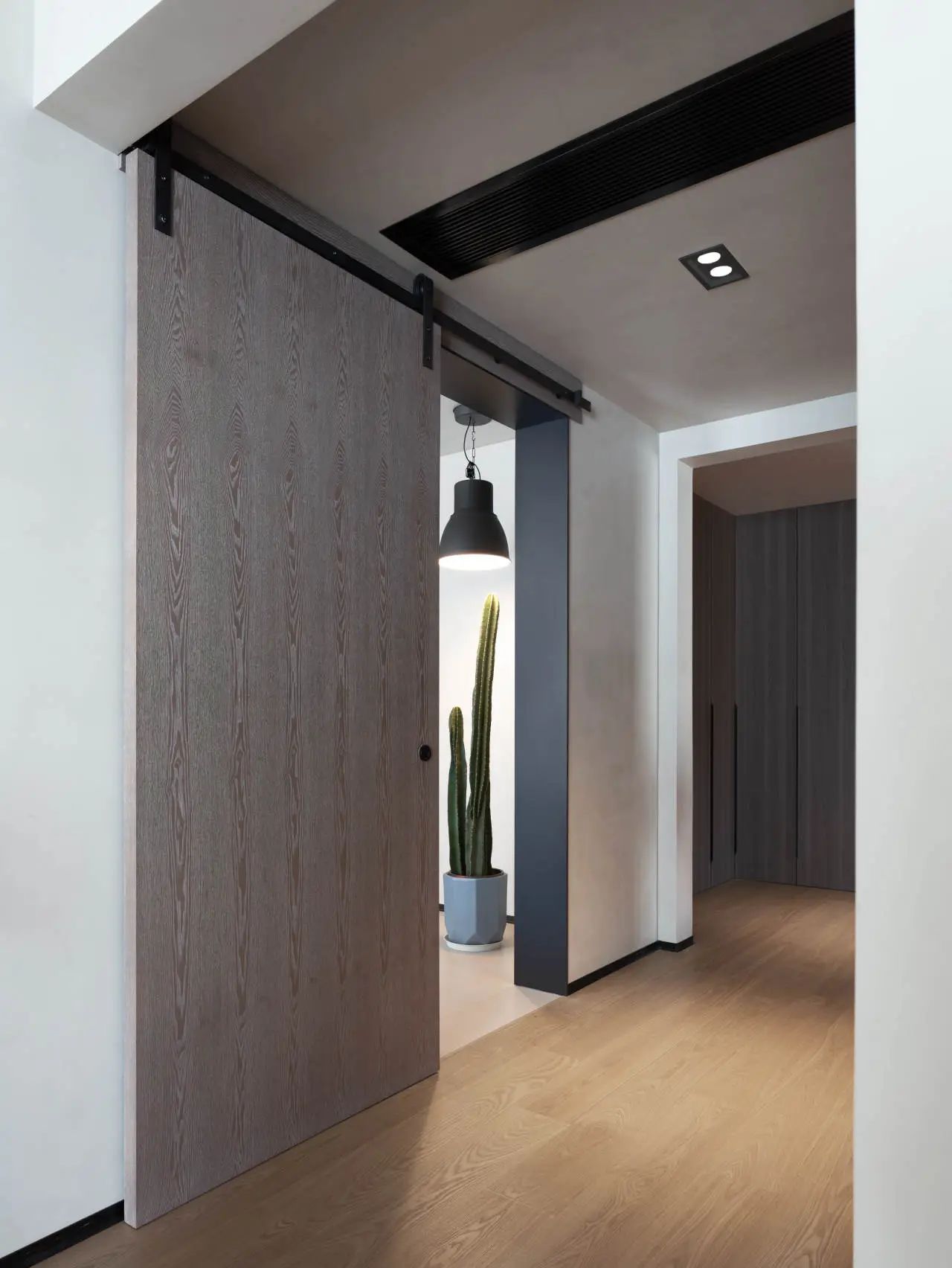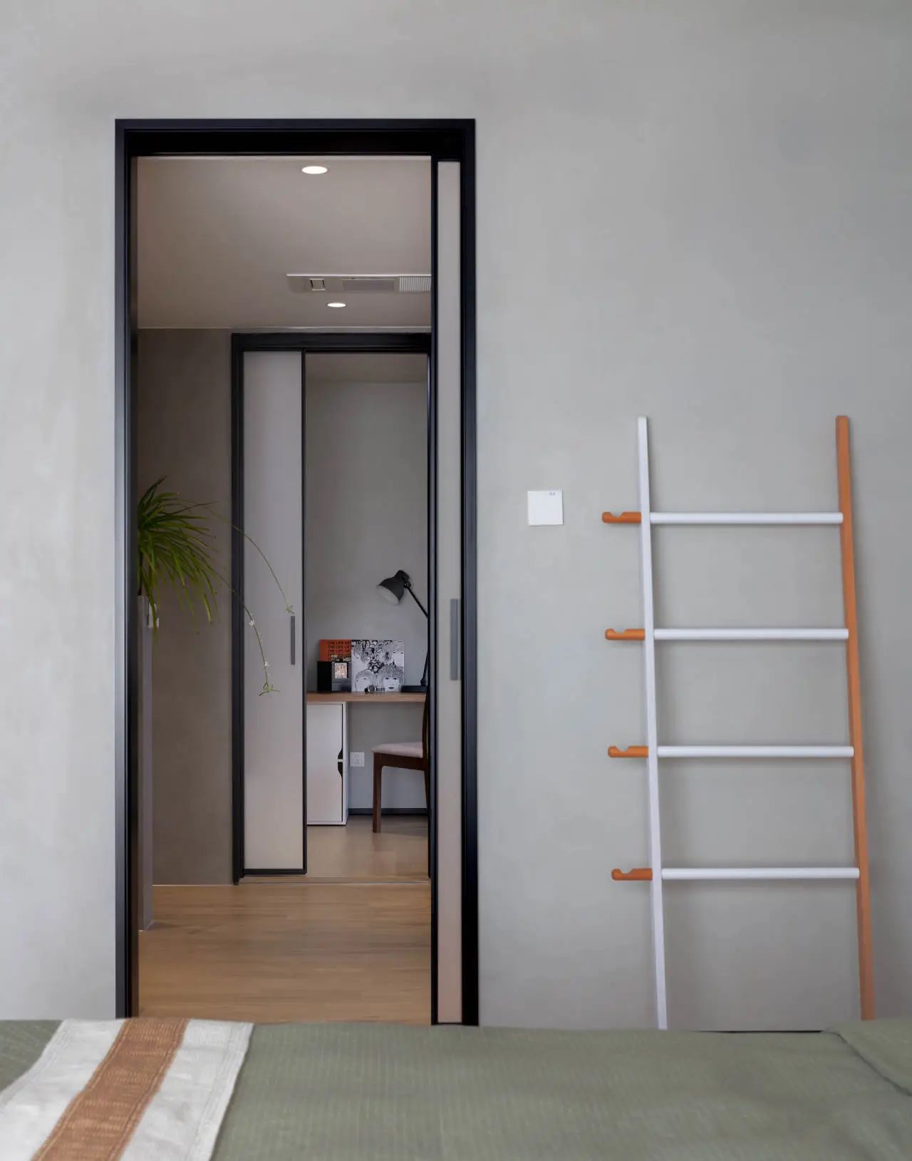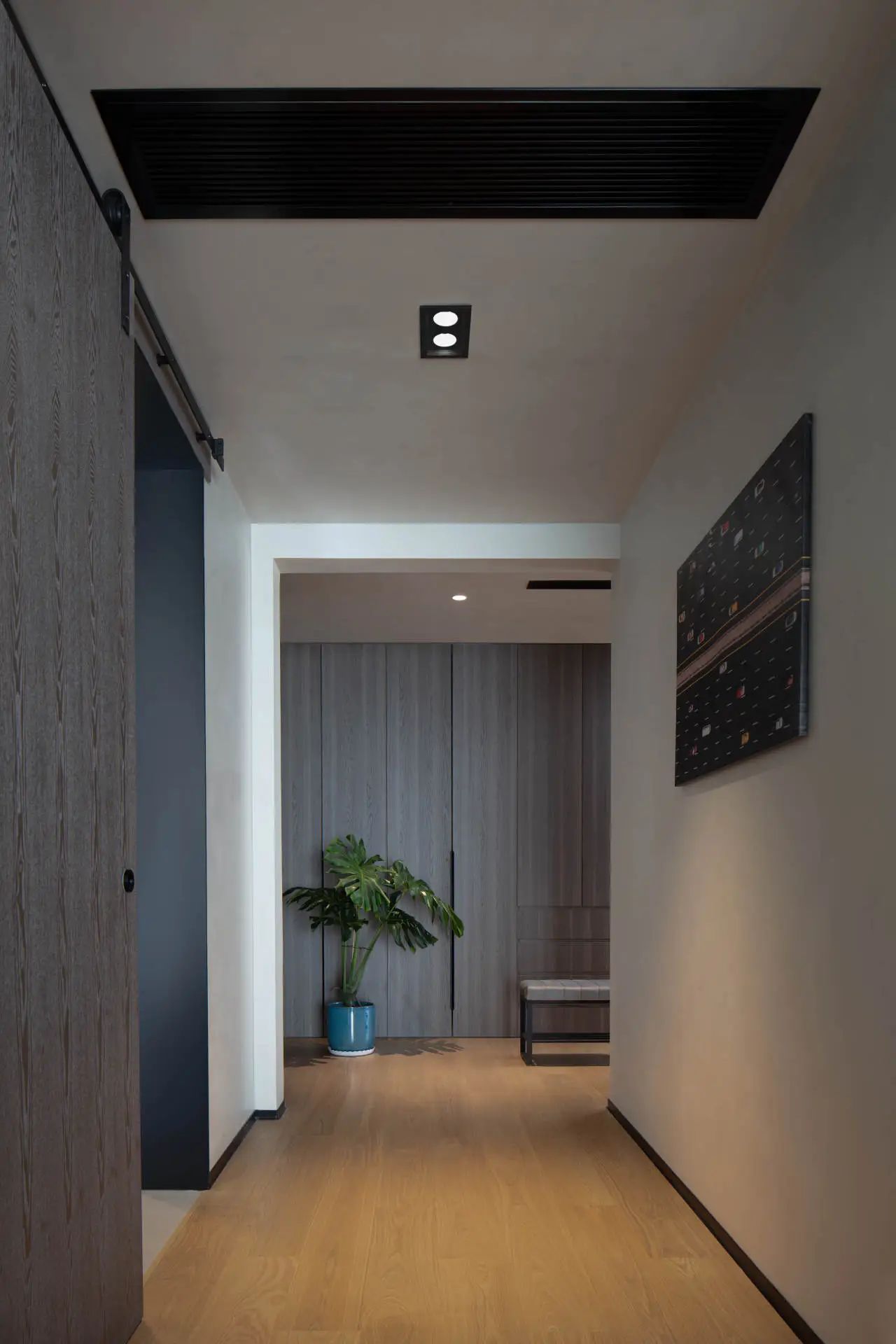 玄关区域则采用了极简设计理念,摒弃繁复装饰,仅增设了一处滑板架,既满足了日常收纳需求,又彰显了空间的实用与个性魅力。