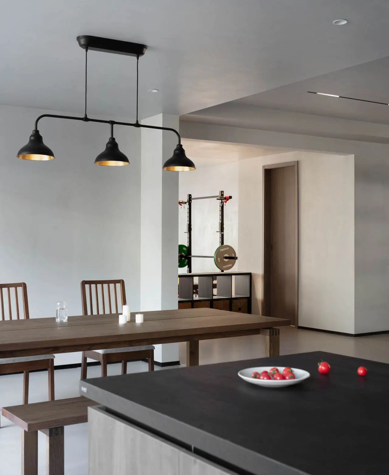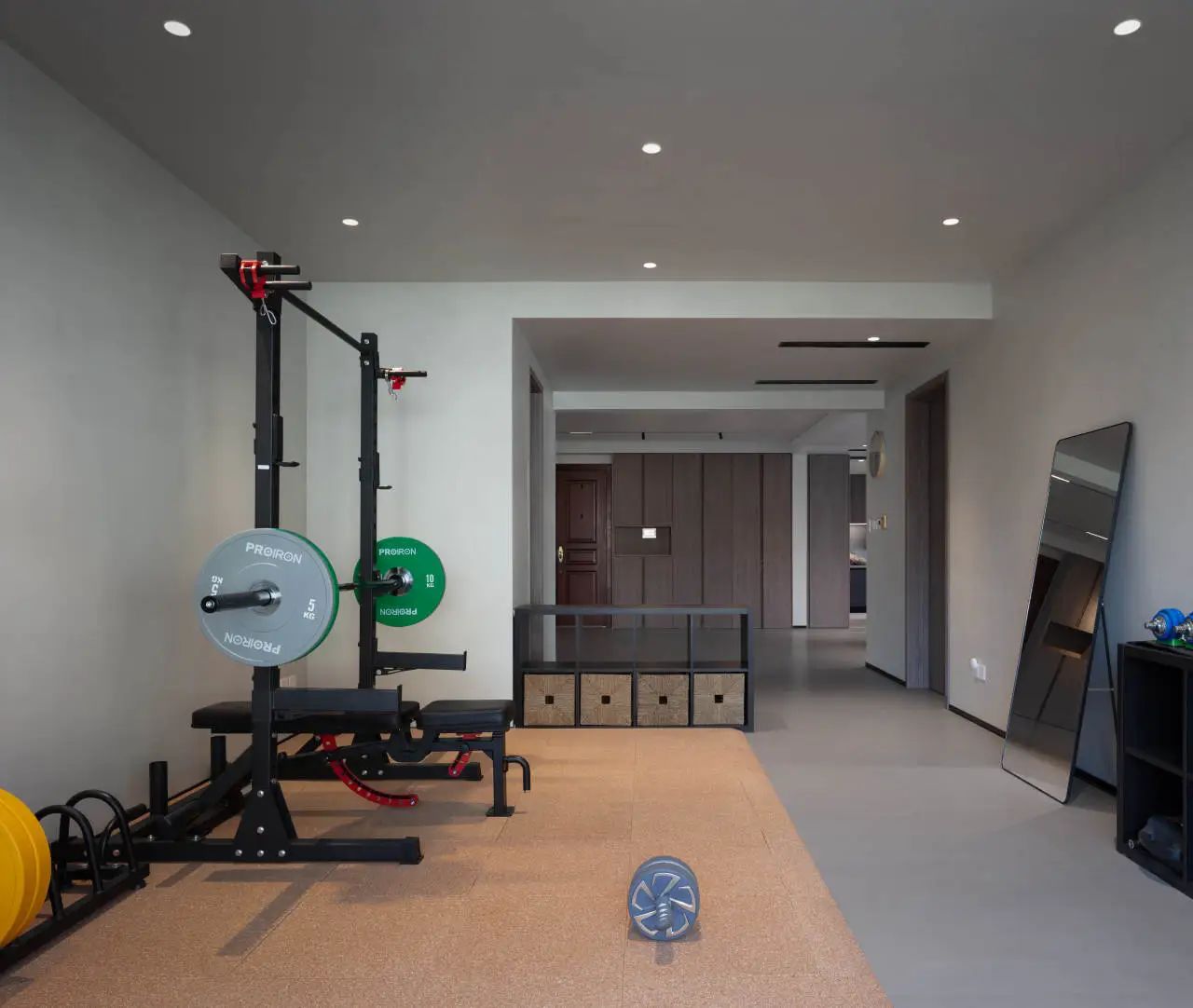 玄关后是一个半开放式的空间,这里被打造成了一个小巧而精致的健身房,与完整的运动动线流畅地衔接在一起,无论是早晨的唤醒运动,还是夜晚的放松拉伸,这里都能成为你释放压力、塑造健康的理想之地。