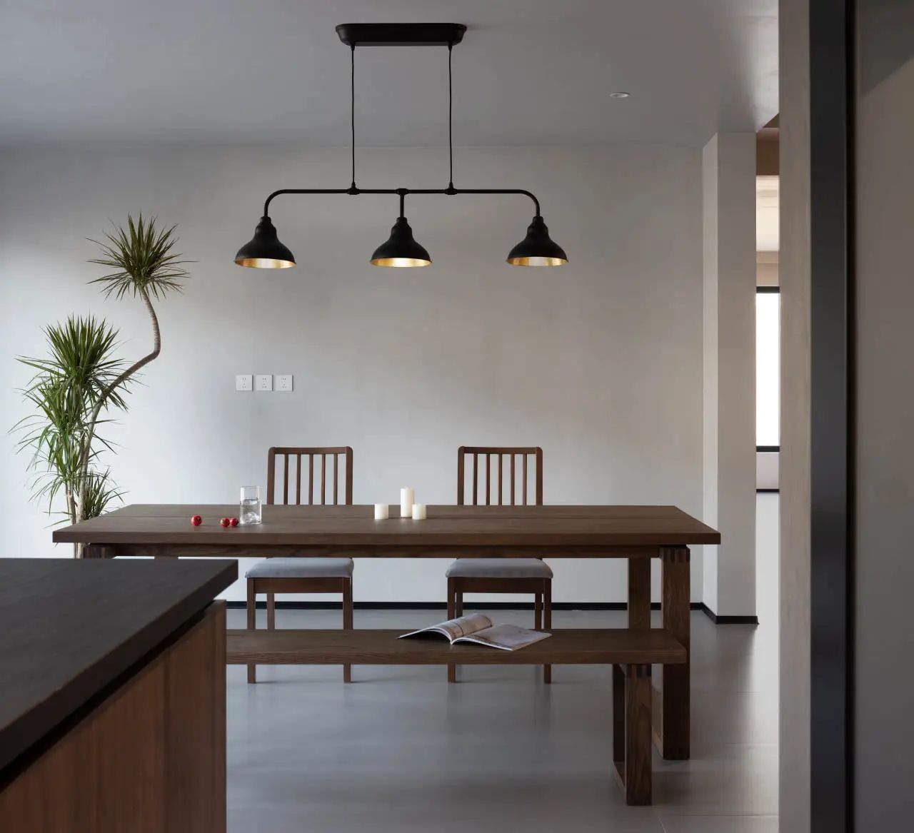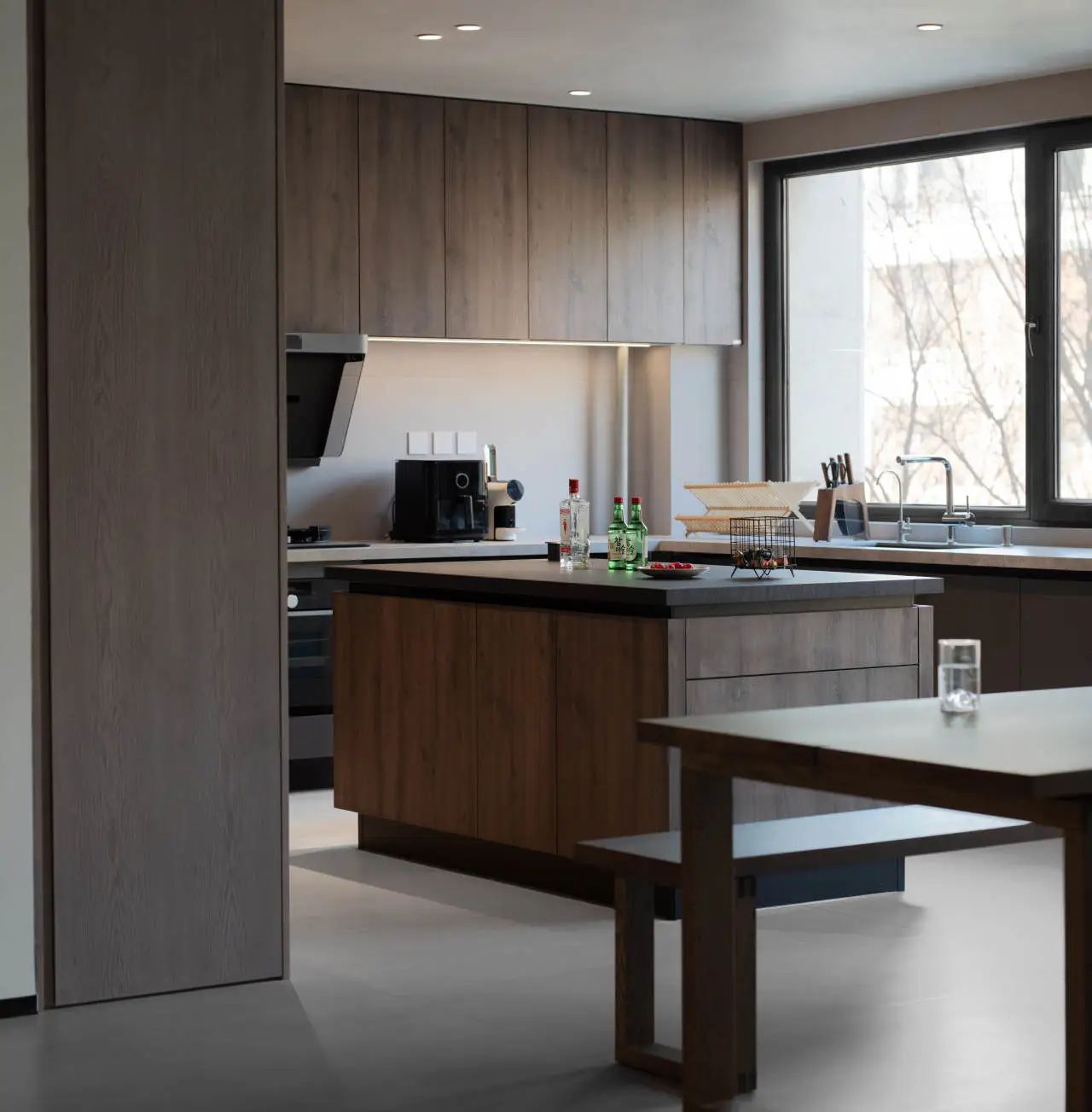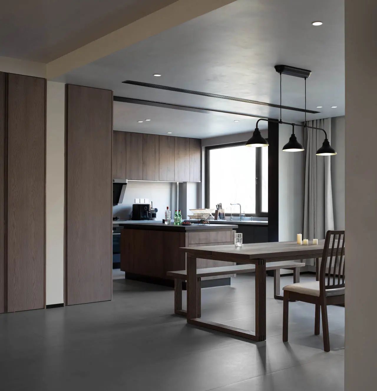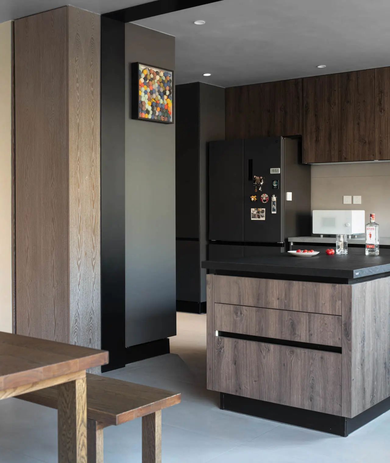 一张木质大长桌与方形大岛台相得益彰,它们的融合不仅显得温润而自然,还为整个以黑白灰为主色调的空间增添了一抹生动与温馨,仿佛瞬间点亮了人间的烟火气息。