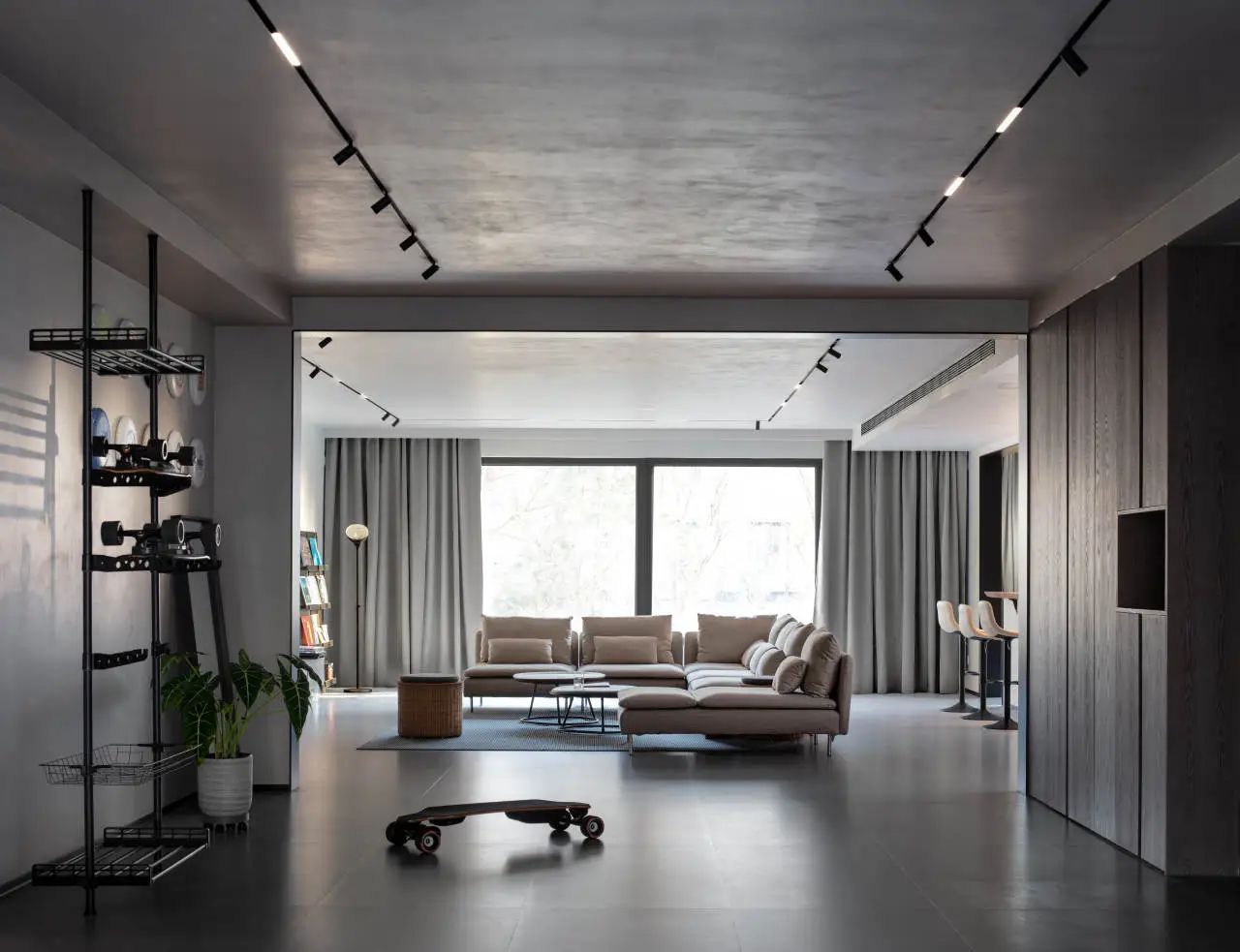 精心规划了回游动线,确保业主能够驾驶他的电动滑板在空间中自由穿梭,这一看似简单的设计实际上在工艺上极为复杂,需要极高的材质咬合和细节收口。正是这样的匠心设计,让空间的现代工业风格与精细工艺形成了鲜明对比,既展现了粗犷的美,又不失精致之感。
