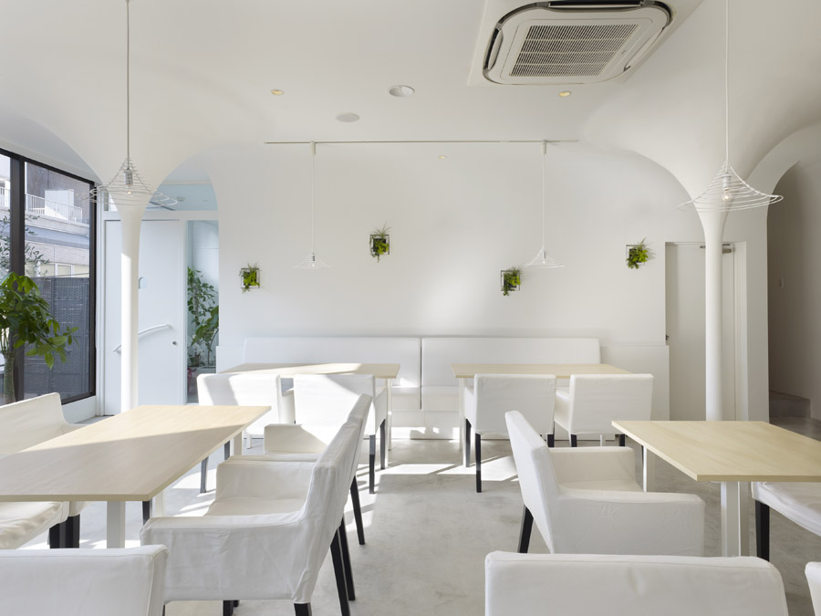 XXXX设计了一家咖啡厅兼小酒馆。以白色为主的小店,简约的装修搭配清新的绿色小植物,大面积的落地窗,让整个空间看起来更为明亮通透,然而到了晚上,有趣的现象将会出现,利用灯光映射,带来奇幻效果。