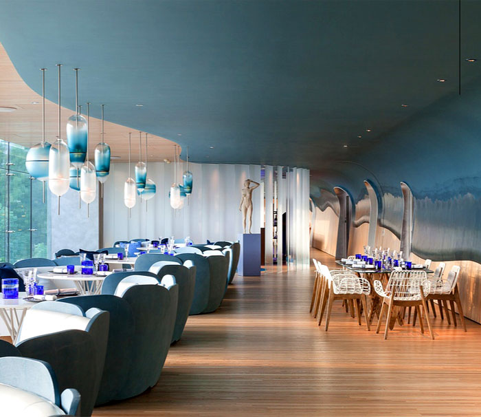 相比于壮阔的群山,浩瀚的大海让人触碰心弦,大海作为餐厅的设计灵感,整个空间的色彩基调,无不展示着海洋的魅力。