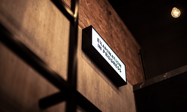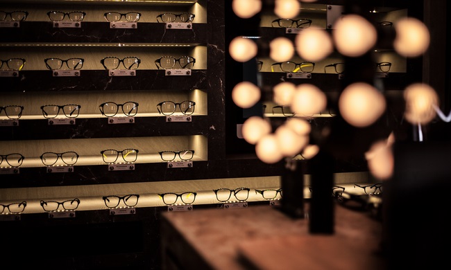 用黑色铁架丰富天花内容,铁架末端系上钨丝灯泡,暗色空间下的灯光显得格外的抢眼,瞬间提升店铺格调。用黑色大理石搭建的展示柜贴墙摆放,售卖的眼镜整齐的排列在上,留下中间区域,方便顾客行走,挑选,交流。 这位于空间中心的储物台,摆放着为数不多的物品,储物台由重新加工的木材设计而成,质朴的材料有着一种放松,安心的感觉。