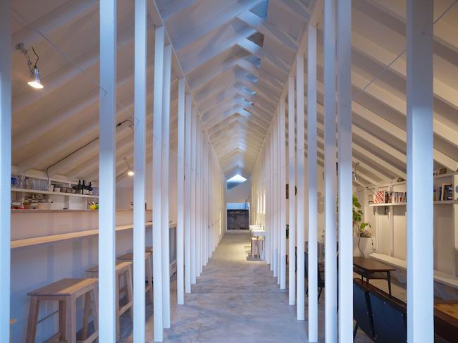 将宿舍与胶囊旅馆的相结合,形成一个紧凑而实用的空间。纯白的内饰很好的减少了空间的压迫感,整齐的木梁柱既起到了支撑建筑的作用还可以清楚的划分功能区域,半镂空的屋顶也让光线进入室内,休息区,酒吧区,客房区,每一块的衔接都十分的巧妙,根据需求客房也分为单人房,双人房和三人房。