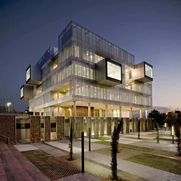 这个项目呈现出标准的庭院模式,设计通过层层的透明性打破了警局的束缚性,将其变成一种社区化的建筑。基本的方形体中间是一个巨大的高高的内部庭院,它视觉上联系服务区与建筑本身。私人的部分非常好辨别,它们就是从玻璃体中悬挑出来的坚固盒子。设计还有一个较明显的元素即是电镀铝网格挡屏,这个挡屏周期性的出现穿孔,从而控制对于外部场地的视野深度和光的穿透性。这些挡板一方面创造出一种从外到内的视觉阻挡,一方面保证从内到外的开阔视野。